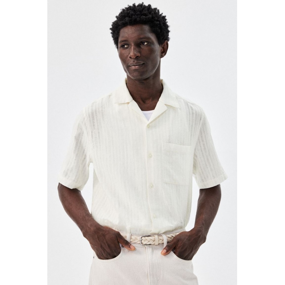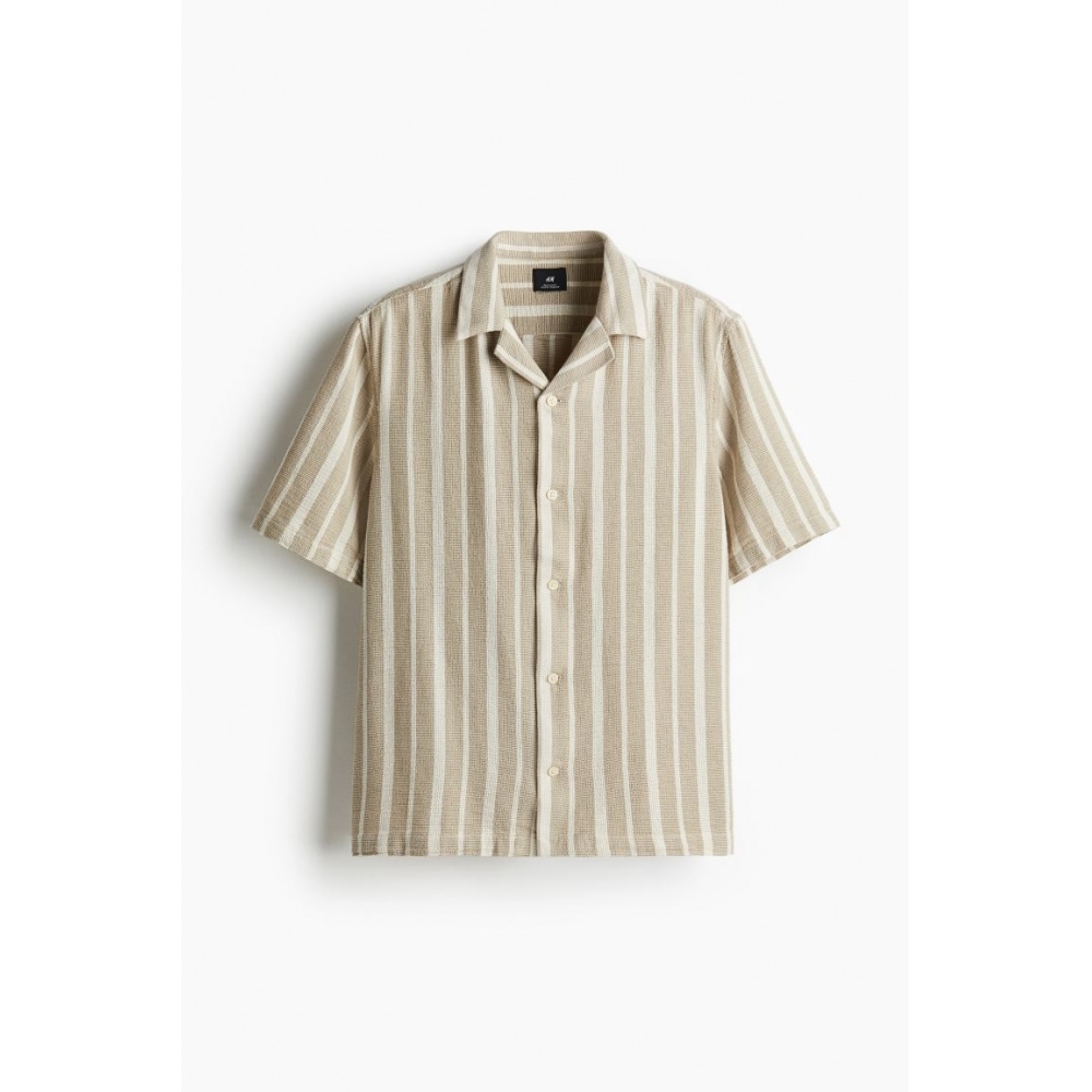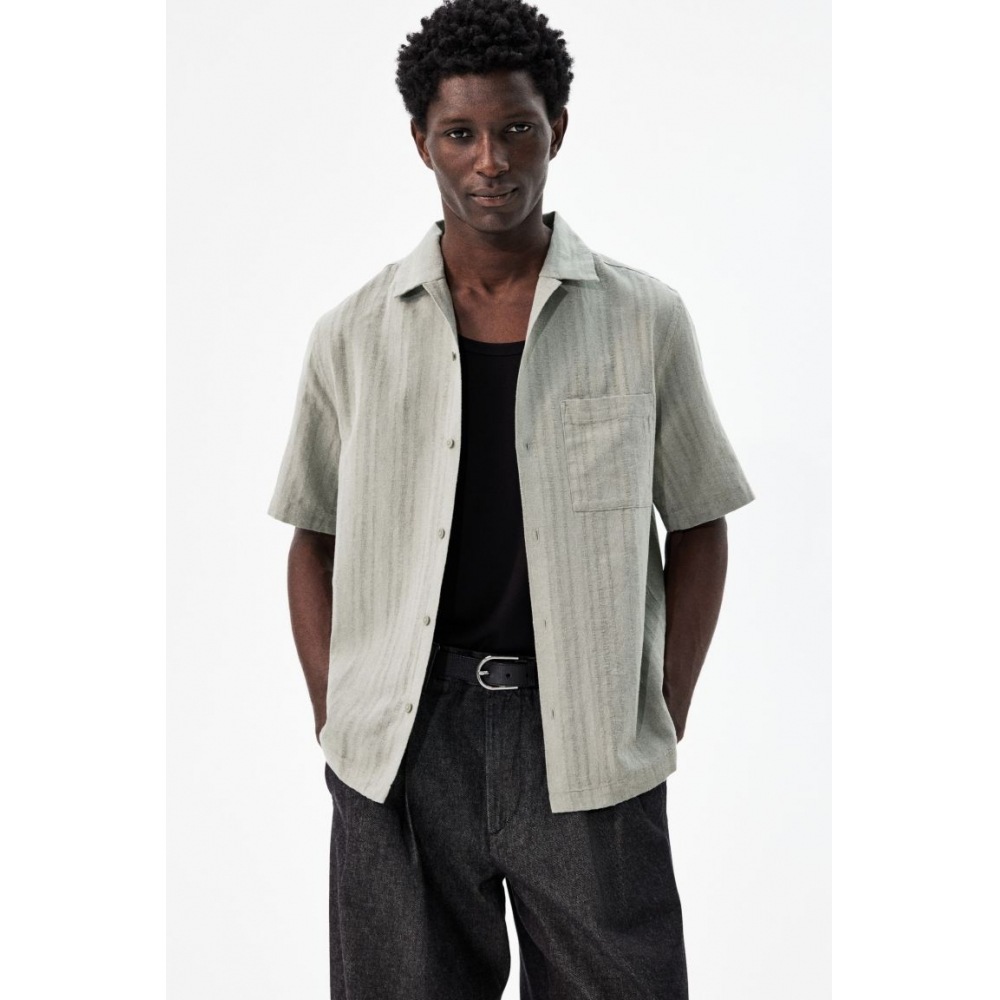 【正規店通販】 H&M レギュラーフィット リネンブレンドシャツ グリーン/ホワイトストライプ
